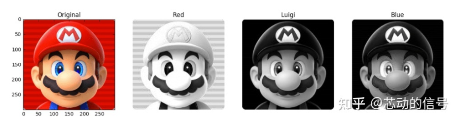 我们可以看到,对于最终的成像,红色平面对强度的贡献更多(三个平面最亮的是红色平面),蓝色平面(最后一张图片)的贡献大多只在马里奥的眼睛和他衣服的一部分。所有颜色平面对马里奥的胡子(最暗的部分)均贡献较少。