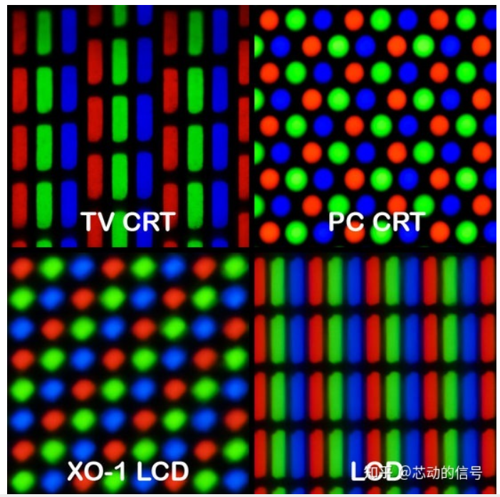 通常, 显示屏 (监视器,电视机,屏幕等等) 仅使用 RGB 模型 ,并以不同的方式来组织,看看下面这些放大效果: