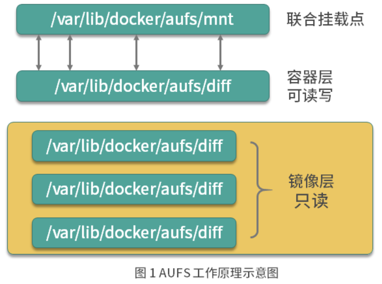 mount 命令创建 AUFS 类型文件系统时,这里要注意,dirs 参数第一个冒号默认为读写权限,后面的目录均为只读权限,与 Docker 容器使用 AUFS 的模式一致。