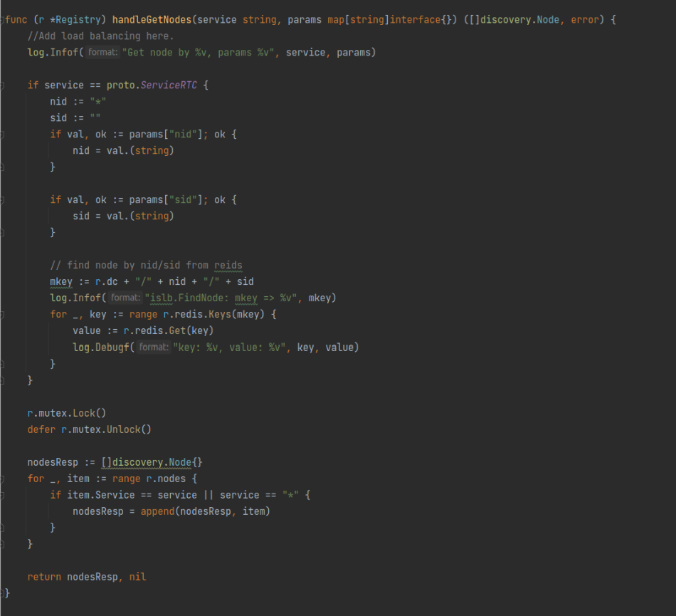 这就是个返回存储的节点信息的操作。在if service == proto.ServiceRTC的里面应该是查询SFU节点的操作,根据一个叫nid的变量和一个叫sid的变量进行的操作,这个nid还有可能是*?那这很有可能是一个根据聊天室Session从数据库里查找对应的视频流在哪个SFU上的操作。但是这查找的结果又没给返回回去,最后也有只是根据服务名称返回了所有符合要求的节点,看这样子所谓负载均衡好像都没完全实现,或者可能是准备删了。