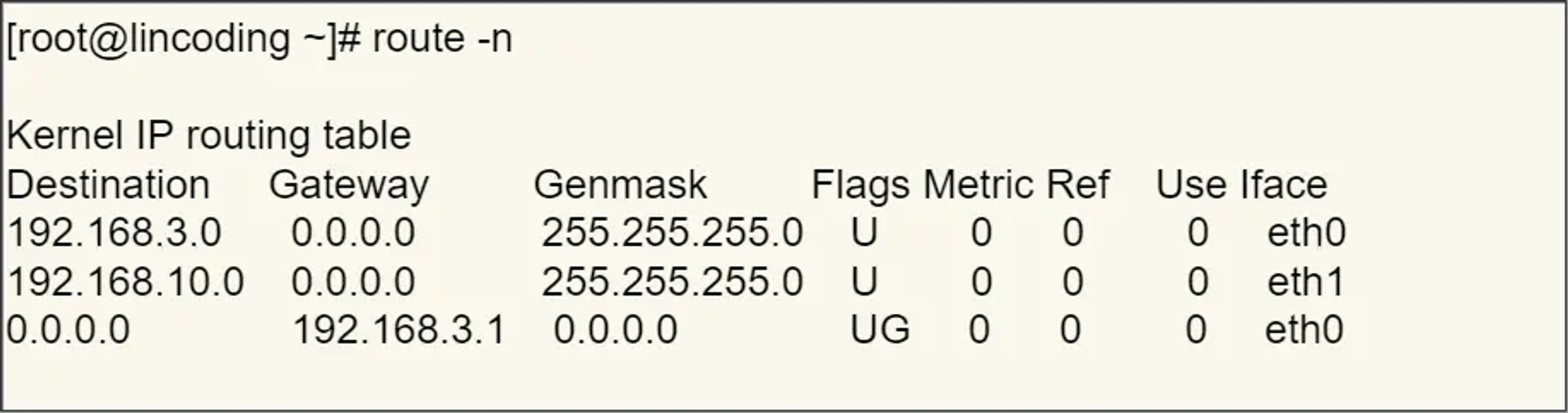192.168.10.0,与第二条目的Destination 192.168.10.0匹配成功,所以将使用eth1网卡的 IP 地址作为 IP 包头的源地址。