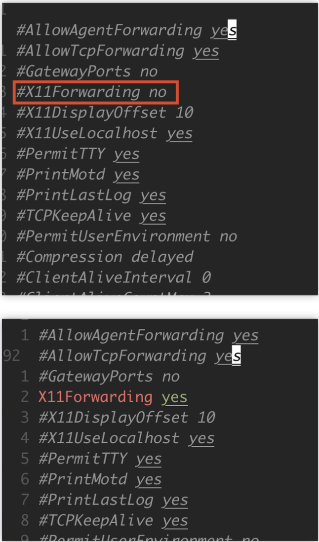 vim /etc/ssh/sshd_config执行命令编辑ssh配置,找到#X11Forwarding no这一项,修改为X11Forwarding yes,注意需要去掉注释符号。