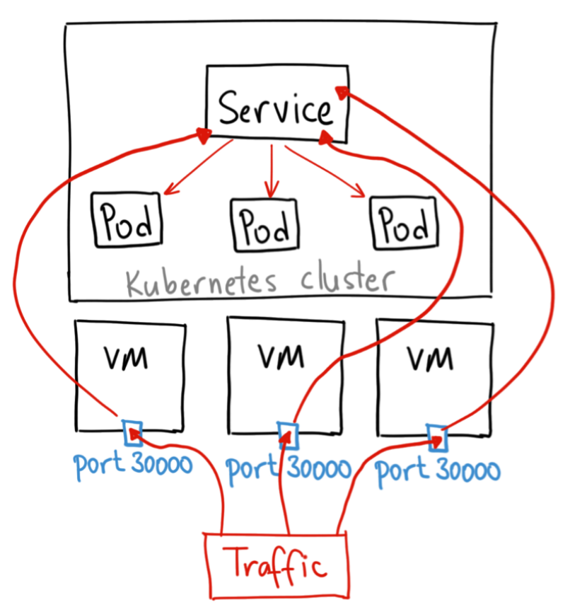 云厂商的负载均衡器按照上报的IP和NodePort自动将流量导到Node上,进而导到Pod中