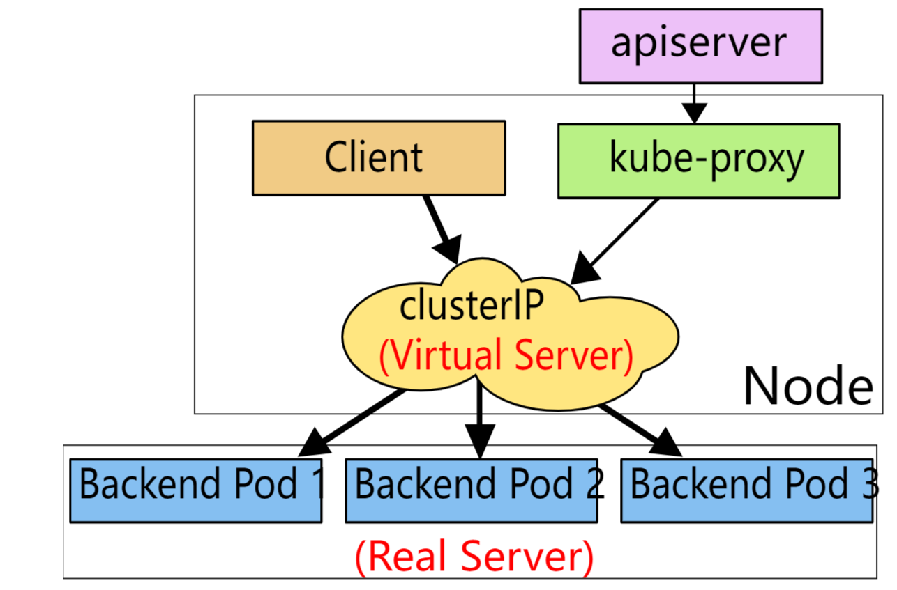 clusterIP(是虚拟 IP)和Port的请求,并重定向到代理端口,代理端口再代理请求到后端Pod。默认情况下,用户空间模式下的 kube-proxy 通过轮转算法选择后端。