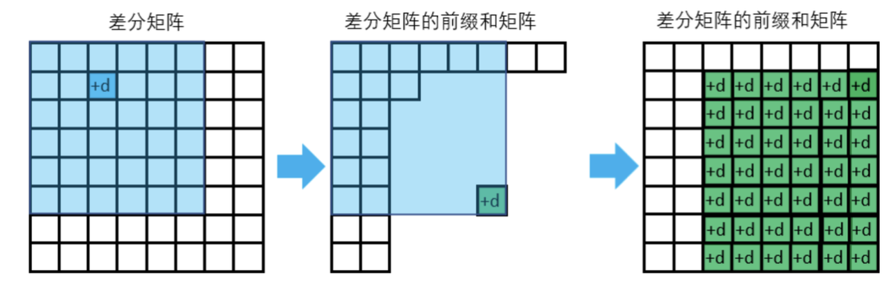差分矩阵的前缀和就是原矩阵;假设已经有了差分矩阵,我们想要使(x1,y1) (x2,y2)这两个点的所有值+d,那么对于差分矩阵 如果在(x1,y1)处+d,那就是(x1,y1)到右下角都+d了 因为前缀和包含了这个(x1,y1)点值的区域都会+d,那么多的区域就要减去也就是 (x2+1,y1) 位置-d 然后(x1,y2+1)-d 最后重复剪掉的(x2+1,y2+1)