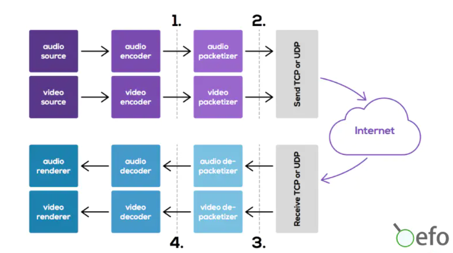 原始码流在发送端捕获,使用选择好的编码方式对帧进行编码后,以包的形式通过网络发送。数据包在接收端被拼装成帧。然后解码器将这些帧解码为原始码流,并进行播放。