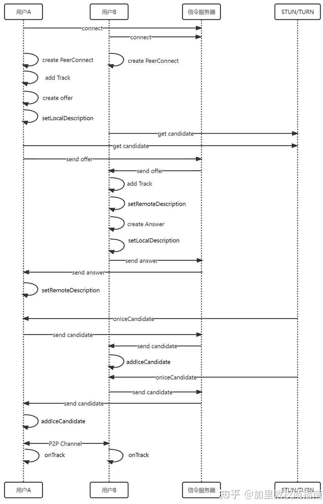 用户 A 作为发起方创建 offer(offer 中包含了 SDP 信息),并将获取的本地 SDP 信息添加到 PeerConnection 中(setLocalDescription),然后再通过信令服务器转发给用户 B;